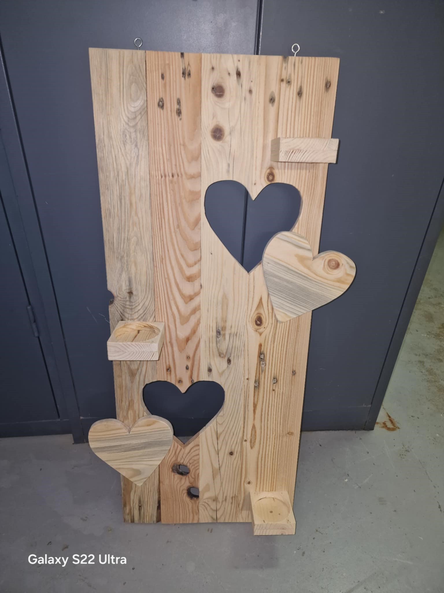 Décoration à suspendre réalisée en bois de récupération par les participants et formateurs du Service Insertion du CPAS de Comines-Warneton.